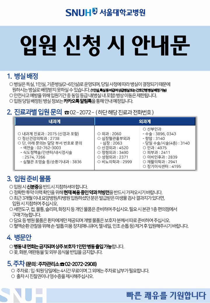 수속이 끝난 후 입원할 병동 간호사실에 입원안내문을 제출하고 간호사의 안내를 받아 입원합니다.