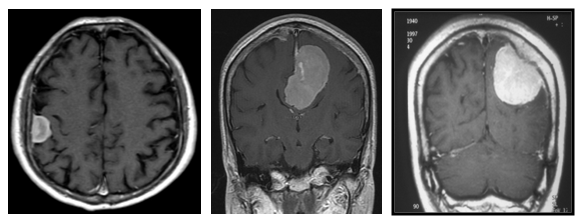 ※ 형광유도물질을 이용한 교모세포종 수술에서 뇌종양세포만 붉은색을 띄고 정상조직은 푸른색을 띄어 종양을 선택적으로 절제하는 데 도움을 받고 있음특히, 최근에 여러 종료의 항암화학요법을 위한 치료제가 개발되었으나, 뇌조직에는 혈류-뇌 장벽(blood-brain barrier)라는 특별한 구조로 인해, 뇌종양의 사용에는 제한적인 효과만 보고 있습니다. 이들 중 Temozolomide라는 경구 항암제는 뇌침투율이 높고 부작용이 적어서, 이를 이용한 항암-방사선 병합치료가 표준치료로써 많이 이용되고 있습니다.2. 뇌수막종뇌수막종(meningioma)는 가장 흔히 접하는 원발성 뇌종양 중의 하나로, 주로 성인에서 발생하며, 2:1의 비율로 여성에게서 많이 발생하는 것으로 알려져 있습니다. 생기는 위치는 천막상부가 90% 이상이나 천막하부 및 드물게 뇌실내에서도 발생합니다. 아래 그림에서 보듯이 뇌수막종의 임상증상은 종양의 위치와 크기에 따라 달라지게 됩니다. 주로는 두개강내압 항진에 의한 증상과 신경세포의 국소적 자극으로 나눌 수 있으며, 최근 들어 CT, MRI의 보급이 늘면서 증상이 없이 우연히 발견되는 경우가 많습니다.가장 대표적인 치료법은 수술적 방법을 통한 완전제거입니다. 하지만, 이는 뇌수막종의 위치나 크기, 신경학적 장애 위험 등을 모두 고려해야 합니다. 최근에는 잔여 종양이나 재발 종양에 감마나이프 수술 등의 방사선 수술을 시행함으로써 종양조절률을 높이고 신경학적 장애를 적게 남기는 방법도 많이 이용되고 있습니다.뇌수막종의 경우에는 양성종양이 대부분을 이루고 있지만, 세포분화도가 높은 이형성 수막종(atypical meningioma), 악성 수막종(anaplastic meningioma) 등이 있으므로, 정밀한 병리학적 진단이 필요하며, 경우에 따라서는 추가 치료가 필요한 경우도 있습니다.
